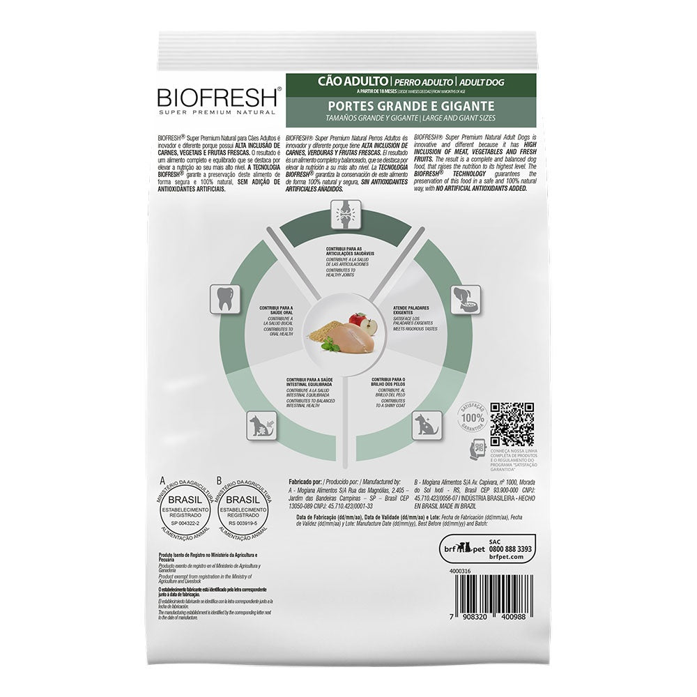 Biofresh Adultos Razas grandes o gigante es un alimento Super Premium completo y equilibrado que se destaca para elevar la nutrición de los perros de razas grandes y gigantes a su más alto nivel. Biofresh es innovador y diferente, porque esta formulado con una alta inclusión de ingredientes realmente frescos, directamente de la naturaleza. La tecnología Biofresh garantiza la conservación de este alimento de forma 100% natural y segura, sin conservantes artificiales añadidos.