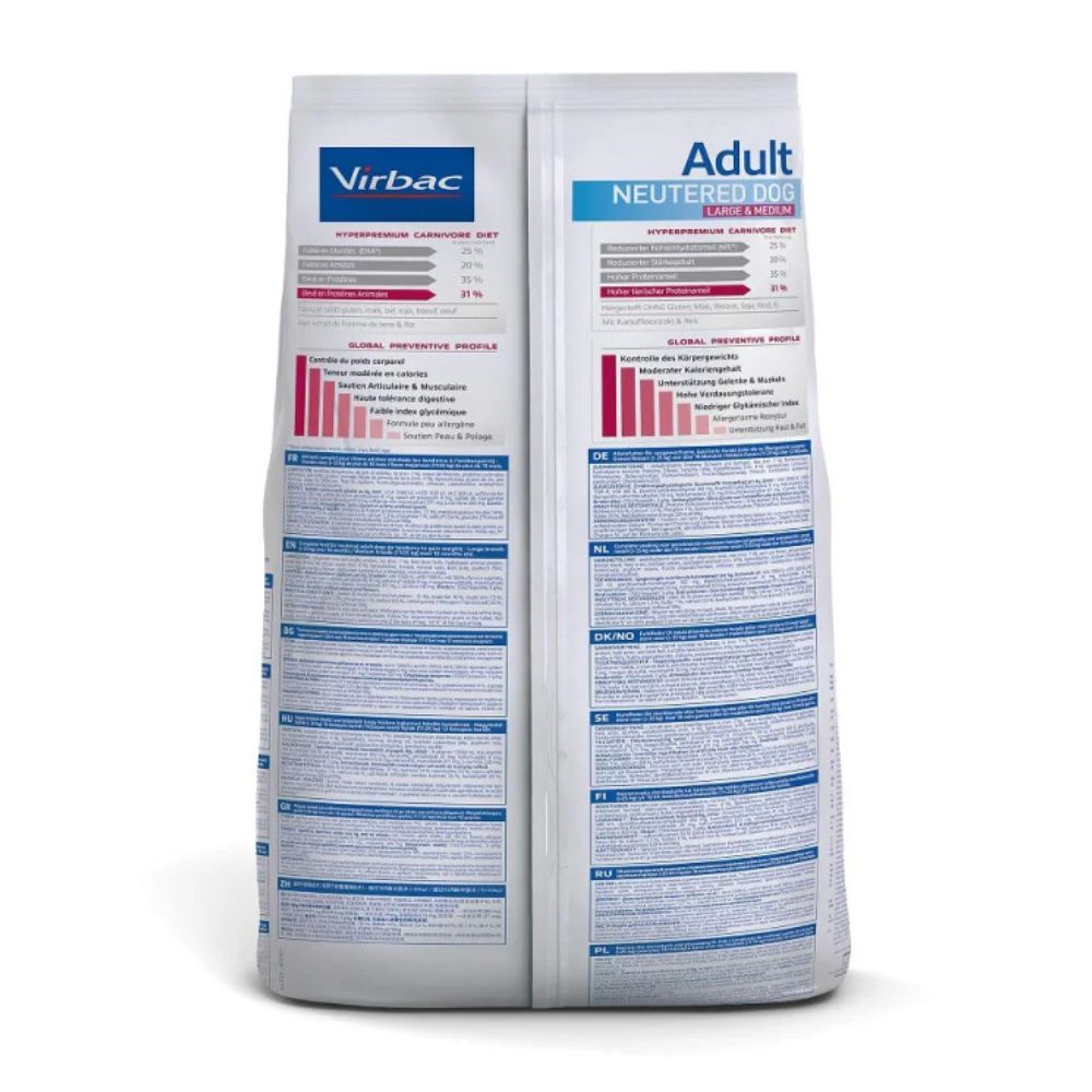 VIRBAC HPM Adult Neutered Dog Large & Medium está indicado para perros adultos esterilizados (o con tendencia a ganar peso): Razas grandes (> 25 kg) a partir de los 18 meses y medianas (10-25 kg) a partir de los 12 meses. Fórmula baja en hidratos de carbono y rica en proteínas diseñada para acercarse al máximo a las necesidades nutricionales de los carnívoros. El resultado es una nutrición que se adapta perfectamente a las necesidades de tu perro. 35% Rica en proteínas (con 89% de proteínas animales) 25% Bajo en carbohidratos.