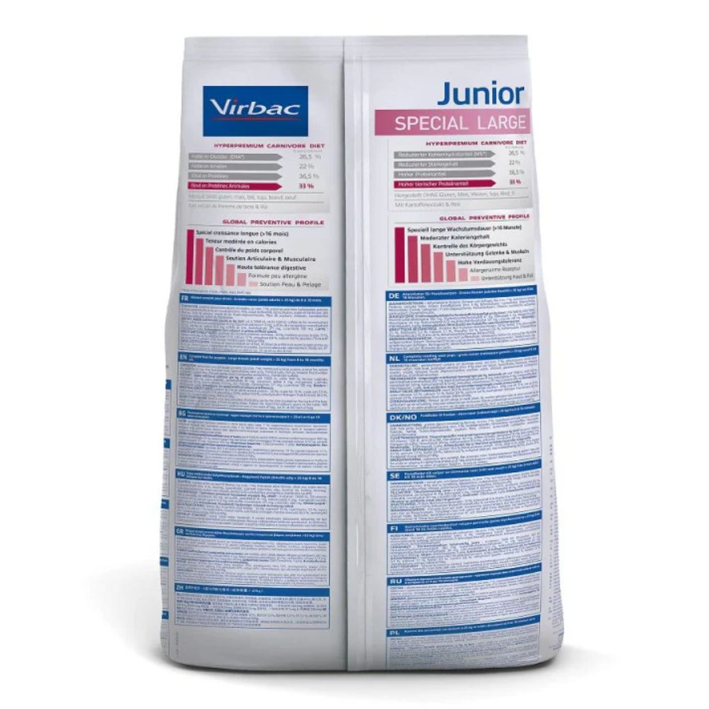 VIRBAC HPM Junior Dog Special Large está indicado para cachorros razas grandes (peso adulto mayor de 25 kg), después del pico del crecimiento, esto es, de los 8 a 18 meses de edad. Fórmula baja en hidratos de carbono y rica en proteínas diseñada para acercarse al máximo a las necesidades nutricionales de los carnívoros. El resultado es una nutrición que se adapta perfectamente a las necesidades de tu perro. 36,5% Rica en proteínas (con 91% de proteínas animales) 26,5% Bajo en carbohidratos.