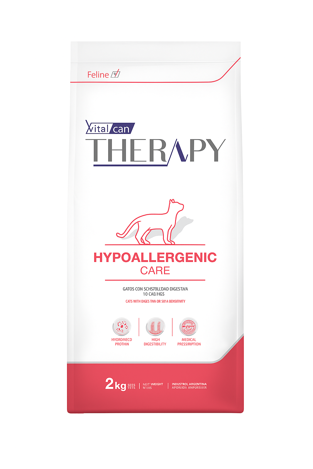 Vitalcan Therapy Feline Hypoallergenic Care es un alimento de prescripción formulado especialmente para gatos de todas las edades con alergias o intolerancias alimentarias, así como para aquellos con enfermedad inflamatoria intestinal (EII) o trastornos digestivos y cutáneos asociados. Es una excelente opción como dieta de exclusión, ideal para descartar sensibilidades a determinadas proteínas.