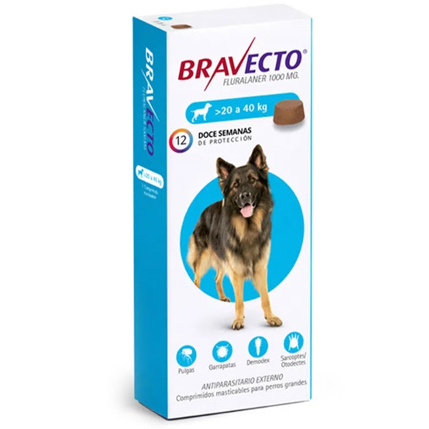 • Perros >20-40kg: 1 comprimido Bravecto de 1000mg.