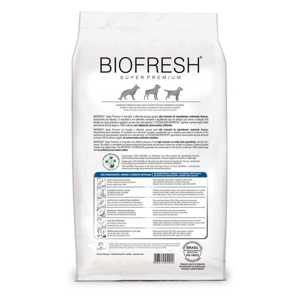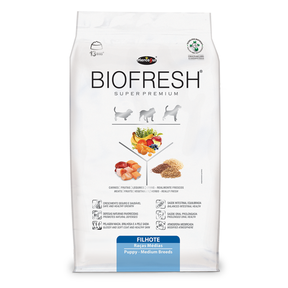 Biofresh Cachorro raza Mediana es un alimento Super Premium completo y equilibrado que se destaca para elevar la nutrición de los cachorros de razas medianas a su más alto nivel. Biofresh es innovador y diferente, porque esta formulado con una alta inclusión de ingredientes realmente frescos, directamente de la naturaleza. La tecnología Biofresh garantiza la conservación de este alimento de forma 100% natural y segura, sin conservantes artificiales añadidos.