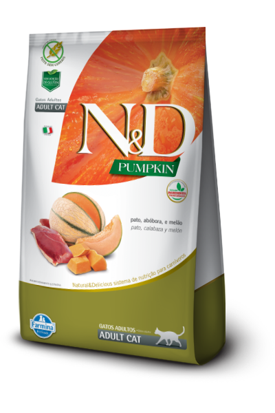 N&D Pumpkin Feline Adult - pato, calabaza y melón es un alimento completo, balanceado y libre de grano indicado para gatos adultos. Elaborado a base de pato, calabaza y melón cantalupo. Con un 96% de proteína de origen animal. Sin conservantes artificiales. Bajo índice glicémico.