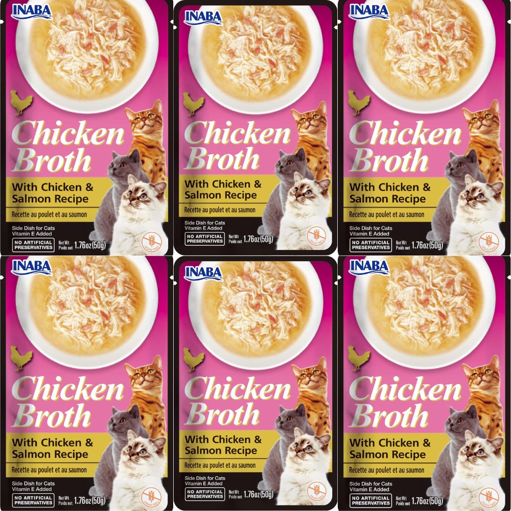 Chicken Broth Receta de Pollo y Salmón – Caja x 6 Unidades (50 g c/u) – Snack Cremoso para Gatos