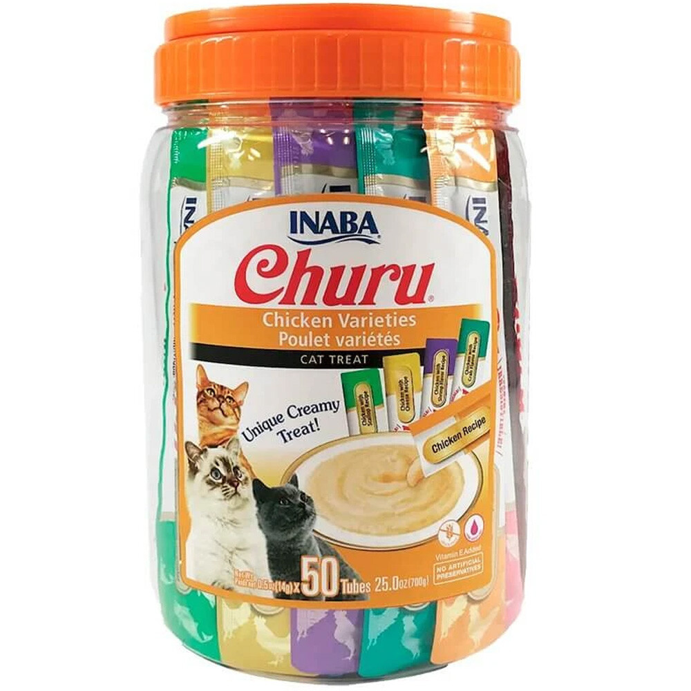 Consiente a tu gato con la experiencia única de Inaba Churu, los snacks cremosos y deliciosos que todos los mininos adoran. Este práctico frasco con 50 unidades reúne una irresistible variedad de sabores preparados con pollo natural y toques de ingredientes seleccionados, para darle a tu felino un premio sano y lleno de amor.