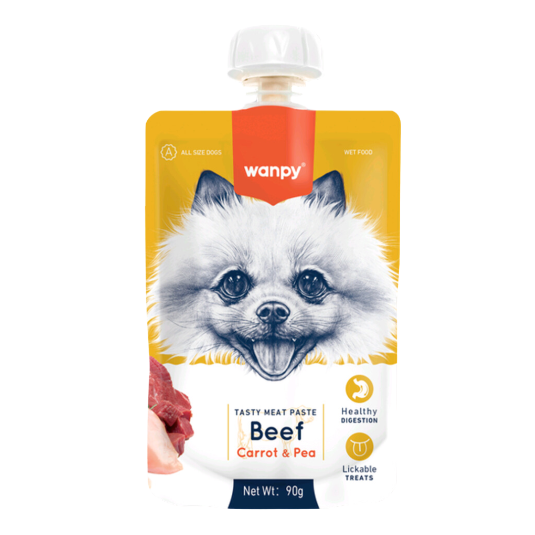 Wanpy Tasty Meat Paste Vacuno con Zanahoria y Guisantes para Perros, es un festín de sabor y salud, esta pasta premium de carne de vacuno, combinada con zanahoria y guisantes, es el snack ideal para perros de todas las edades. Libre de granos, soya y gluten, promueve una digestión saludable y está enriquecida con vitaminas esenciales. Perfecta como premio nutritivo entre comidas.