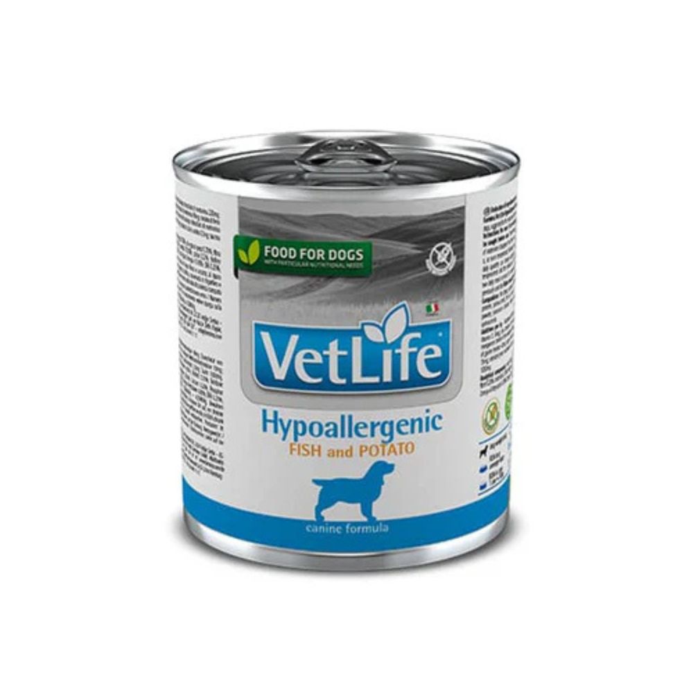 Vet Life Hypoallergenic Fish & Potato es una lata de alimento húmedo y medicado formulado para la reducción de la intolerancia alimentaria en perros. También se recomienda como coadyuvante en el soporte de la función trófica de la piel y de sus apéndices: ojos, oídos, sacos anales. Lata de 300 g.