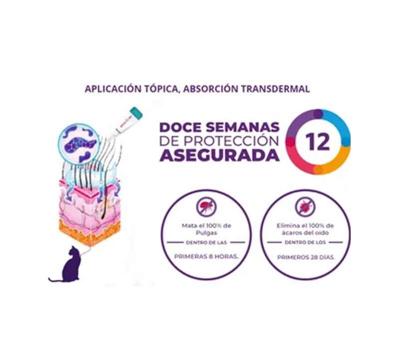 BRAVECTO TRANSDERMAL es una solución tópica de fácil aplicación para el tratamiento de infestaciones por pulgas, garrapatas y ácaros en gatos con protección de 12 semanas continuas.