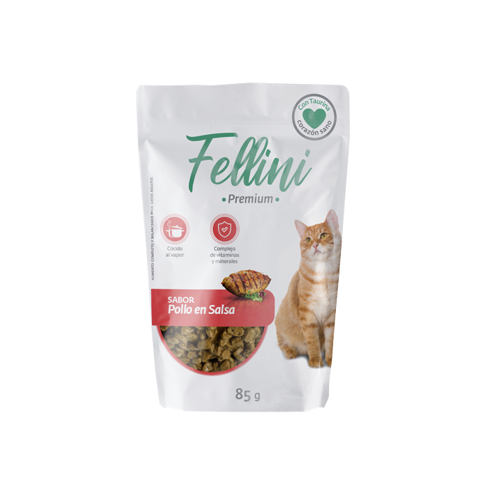 Fellini pollo en salsa es un alimento completo y balanceado, formulado por médicos veterinarios y producidos bajo estándares de calidad europeos. Sus ingredientes han sido seleccionados para entregar una nutrición equilibrada y un sabor único que deleitará el paladar de tu gato.