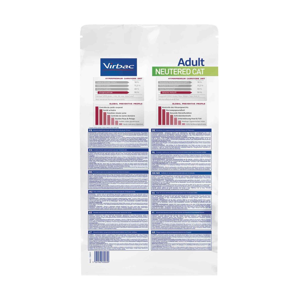 VIRBAC HPM Adult Neutered Cat está indicado para gatos adultos esterilizados y no esterilizados, a partir del año de edad. Los gatos adultos esterilizados están predispuestos a sufrir dos problemas importantes: exceso de peso y enfermedad del tracto urinario inferior. Fórmula baja en hidratos de carbono y rica en proteínas diseñada para acercarse al máximo a las necesidades nutricionales de los carnívoros. El resultado es una nutrición que se adapta perfectamente a las necesidades de tu gato. 44,5 % Rica en proteínas (con 92 % de proteínas animales) 19,5 % Bajo en carbohidratos.